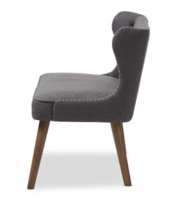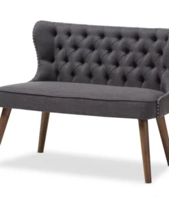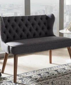 The Scarlett 2-seater loveseat settee is not the type of furniture to stay hidden in a corner. Channeling a brilliantly bold mid-century modern style, the Scarlett is a head turning design perfect for the modern home and commercial office. Silver nail heads trim around the sweeping curves of the backrest creating a welcome embellishment that accentuates the unique curved shape of its button-tufting backrest. Each element of the settee is not just stylish and up to-date, but also carefully sourced to ensure the highest production standards. The Scarlett loveseat is above all built for comfort and sturdiness. The inner metal frame provides a solid construction to support the webbed seat, while the medium density foam adds the soft touch that defines the most comfortable upholstery. Solidly supported by walnut rubber wood splayed legs, the Scarlett loveseat has been rigorously stress tested to make sure they hold their own through regular use. Stylish design meets everyday strength. A fully upholstered seat with exposed dark walnut wood looks great from all angles, whether in a lounge arrangement, public waiting area or private office. The splayed legs and button-tufting design add a retro modern touch to this piece of clean lines furniture. The Scarlett features light weight and easy handling. It will be suitable for those urban dwellers with limited space. It could be a cool-looking reading nook within 30 minutes of assembly out of a box. The Scarlett requires assembly.