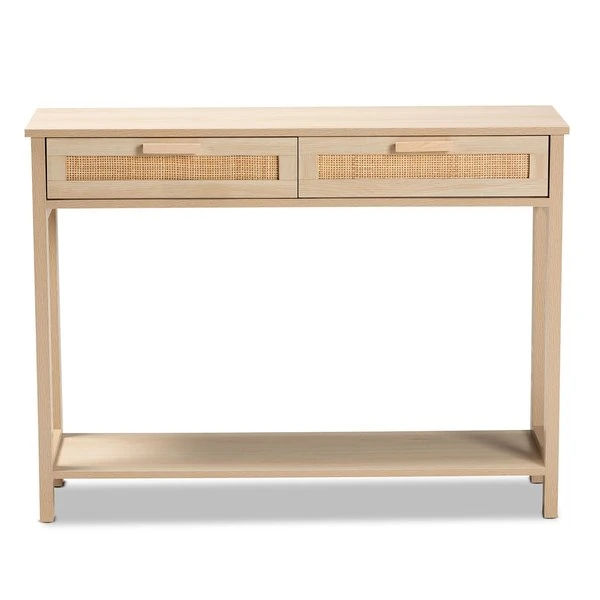 Baxton Studio Sebille Mid-Century Modern Light Brown Finished Wood 2-Drawer Console Table with Natural Rattan