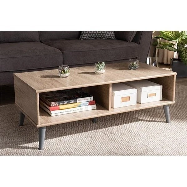 Add simplicity and style to your livingroom with the Pierre coffee table. The clean colors and angled. tapered legs of the table are clear hallmarks of its mid-century modern-inspired design. The Pierres engineered wood frame is finished in a delightful oak and light grey two-tone color palette. The table features two open shelf spaces with a central divider. giving you many possibilities for storage and display of magazines. books. and decor. The Pierres under clearance area makes it easy to clean underneath and around the table. making it a practical addition to your home. The color and minimalist design of the table make it easy to coordinate with your existing decor.The Pierre requires assembly. FeaturesMid-century modern coffee tableOak brown and light grey two-tone finished engineered woodTwo open shelf spacesTapered. angled legsUnder clearance area for ease of cleaningMade in MalaysiaIncludesOne (1) Coffee TableCare instructionWipe CleanSpecificationsColor: Oak Brown/Dark GreyStyle: Mid-Century ModernSeries: PierreMaterial: Wood Bayur/MDFAssemblies Required: YesLegs Height: 5.99" HWarranty: 30 Day LimitedCountry Of Origin: MYShelves Dimension: 7.48" H x 18.82" W x 18.9" DDimension: 14.17" H x 39.37" W x 18.9" DWeight: 31.97 lbs