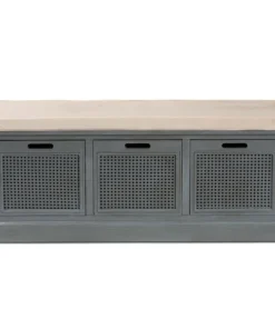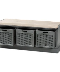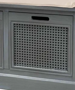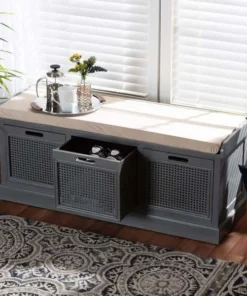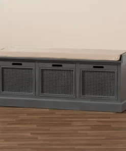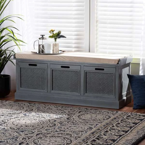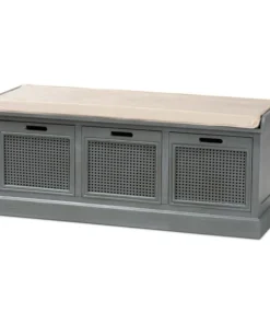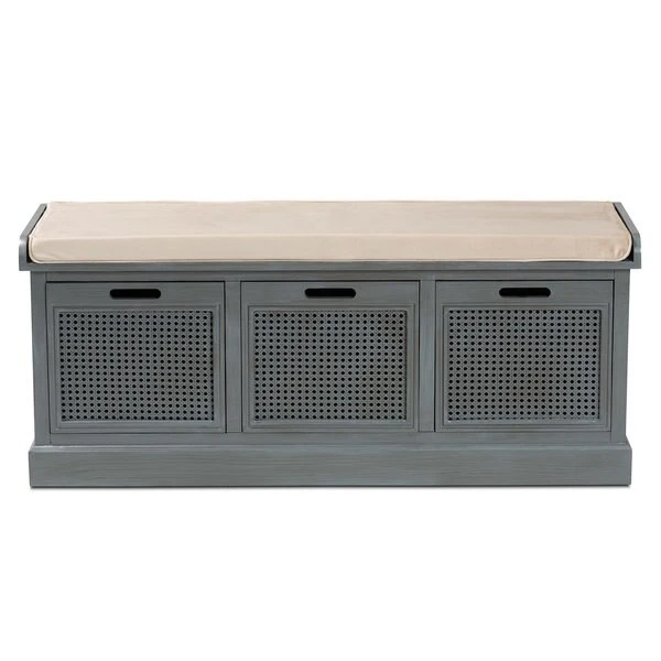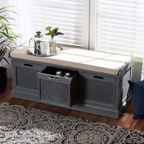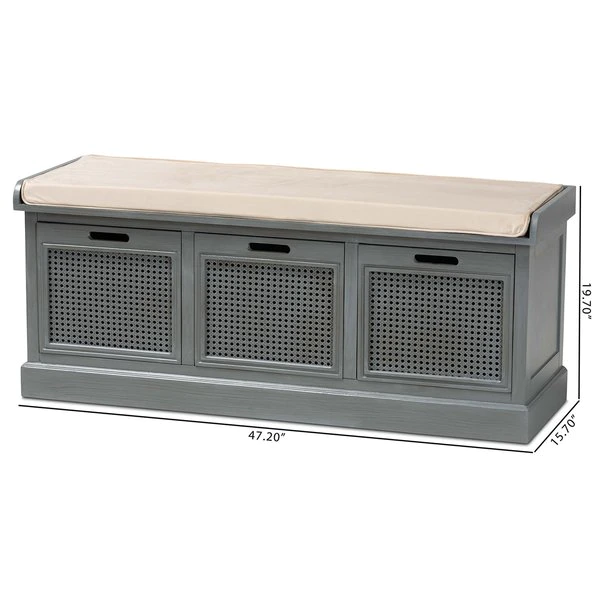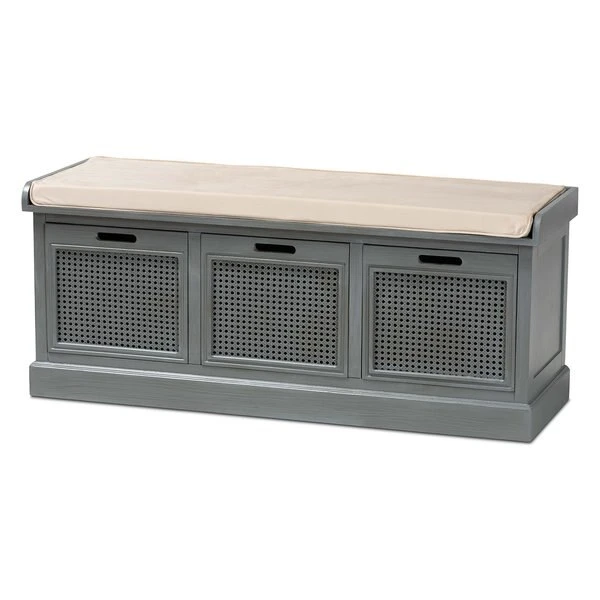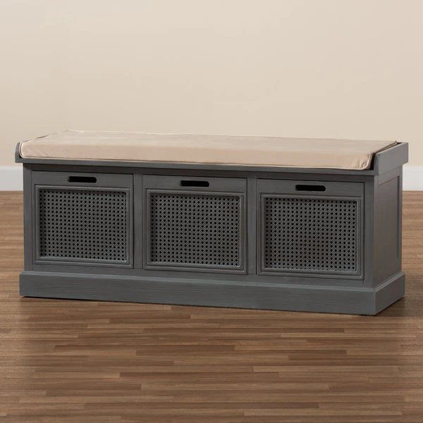With a crisp, contemporary outline, the Sheldon shoe storage bench brings modern convenience to busy homes. Made in China, this shoe bench is constructed from sturdy wood featuring a neutral grey finish that complements any interior style. Three drawers provide secure storage for shoes and boots while woven rattan drawer fronts allow air to circulate and reduce odor buildup. Fully assembled, the Sheldon features a plush foam-padded seat upholstered in smooth fabric for superb comfort when getting ready for the day. A simple yet elegant solution to shoe storage, the Sheldon bench is a fantastic upgrade to any entryway.