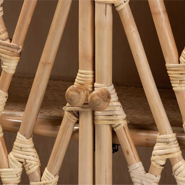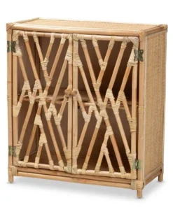 Accommodate your needs while expressing a carefree, tropical mood in your space with the Shena storage cabinet. This handy piece is comprised of a remarkable blend of wood and natural rattan. Two woven rattan shelves behind the doors offer space to organize and arrange your belongings in style. The Shena will arrive fully assembled and features geometric doors that convey an open feel while accentuating the exotic craftsmanship of the piece. Offering essential storage space in stunning design, the Shena storage cabinet is sure to transform the feel of any interior layout.Due to the nature of the natural materials used in this product, it may have variations in areas such as, but not limited to, color, pattern, grain and texture. The hair-like strands of rattan/rattan-fiber are common due to nature of the material.