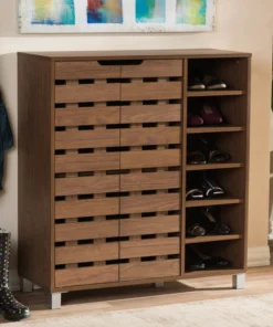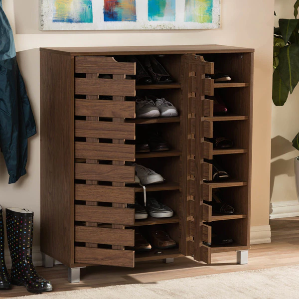 Featuring modern and contemporary design, this fantastic 2-door shoe cabinet with open shelves combines storage with style. The shoe cabinet is complemented by two of its slatted doors for a sleek appearance. Constructed of engineered wood, the shoe cabinet is finished with "walnut" medium brown faux wood grain veneer for practical everyday use. The two pulled out doors reveal six storage shelving space inside and can hold up to 18 pairs of shoes. The open shelves on the right add extra shelving space for another 6 pairs of shoes. To add chic and style, five vinyl feet are added to provide floor clearance. Suitable for your bedroom, living room or entryway area, the Shirley provides modern storage solution for your shoes. The Shirley requires assembly.
