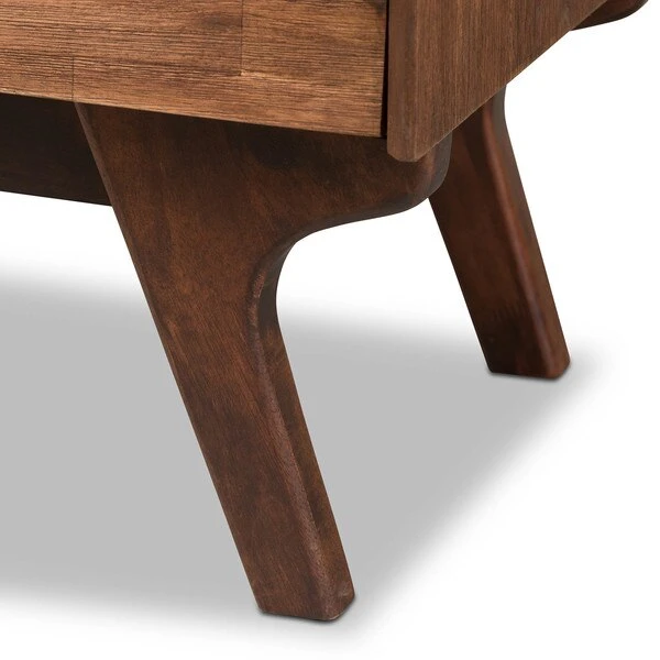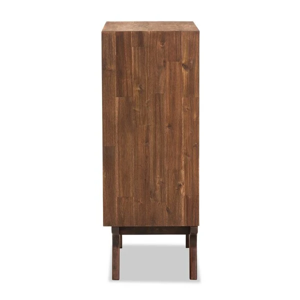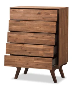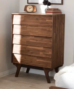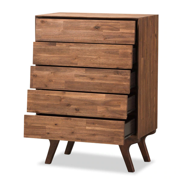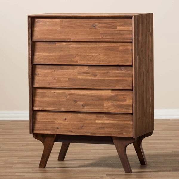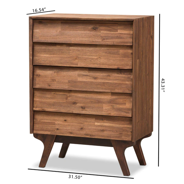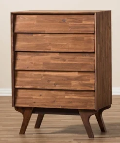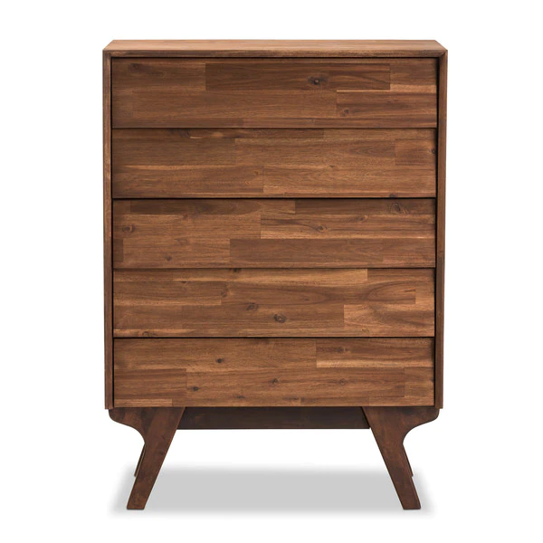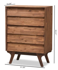 Remodel your bedroom with the clean lines and classic Scandinavian palette of the Sierra 5-drawer chest. Constructed of Acacia hardwood and rubberwood, the Sierra is built for Deep-lasting sturdiness with an easy-to-clean surface. Design features a Deep, rectangular top surface for displaying flowers and décor. Five drawers offer generous storage for bedroom essentials or linen for versatility. The slanted design of the drawers gives it extra character and individual style while the splayed legs showcasing the retro modern look of the collection. Metal hardware and drawer runner ensure Deep-lasting goodness and functionality. Rain oak finishing offers warm look and mid-century modern aesthetic into your bedroom. The Sierra wooden chest requires legs assembly.