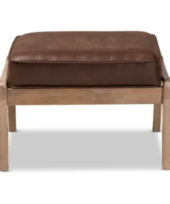 Add a cozy, retro accent to any space with the Sigrid ottoman. Featuring a low profile and wide, angular frame, the Sigrid displays all the hallmarks of mid-century design. The seat is upholstered in a sleek dark brown faux leather effect fabric and is padded with foam for the utmost comfort. Its durable rubberwood frame displays an antique oak finish for a chic, vintage look. Striking from any angle, the Sigrid is well suited for use as seating or as a footrest. The Sigrid ottoman requires assembly.