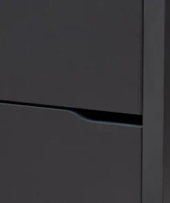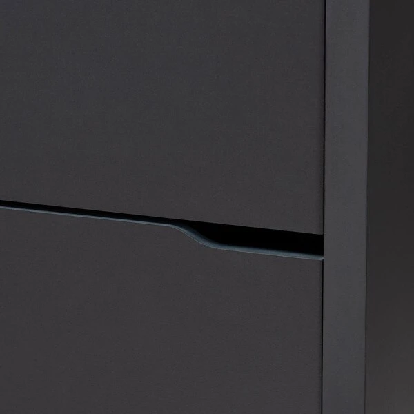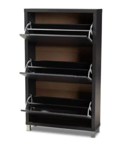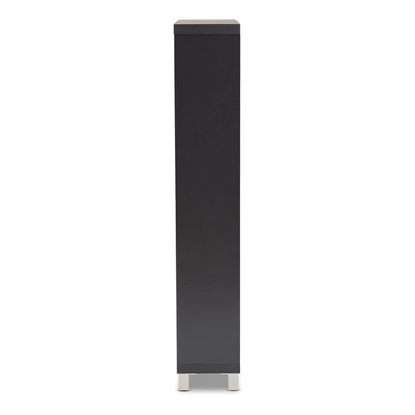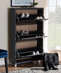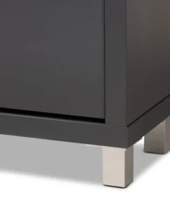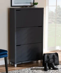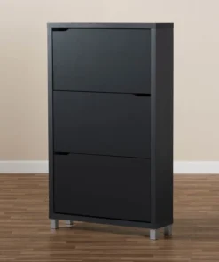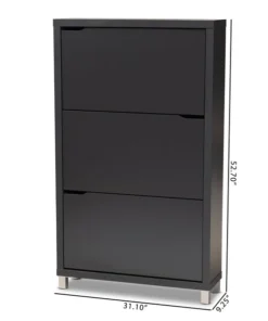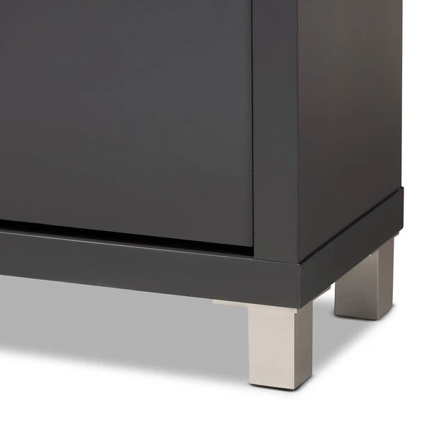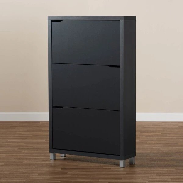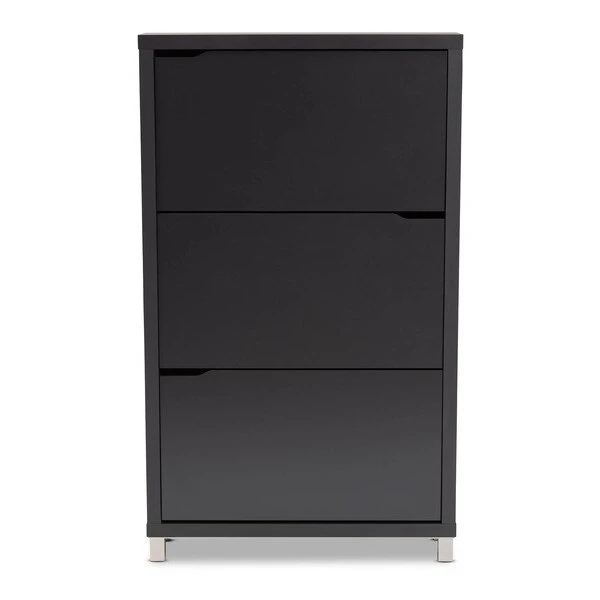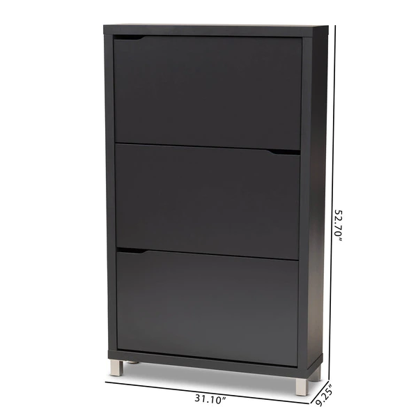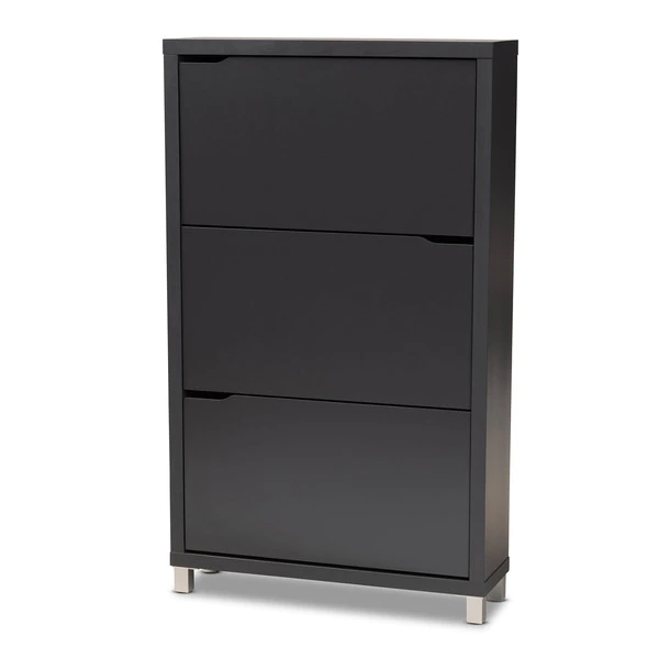 The solution to stylish shoe organization lies within the Simms shoe cabinet. This modern cabinet was designed with a low profile to fit neatly against a wall in a hallway, mud room, or entryway. Three fold-out storage compartments provide space to place up to 18 pairs of shoes. Silver plastic legs add refined style and provide elevation to deter dust buildup. Constructed from engineered wood, the Simms showcases a sleek dark grey finish that complements modern interiors. The Simms shoe cabinet requires assembly.