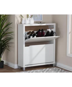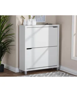Stash your shoes stylishly in our Simms Shoe Cabinet. This modern shoe storage solution was designed with a low profile, svelte size as to fit neatly against a wall in a hallway, mud room, or entryway. Two storage compartments each fit six pairs of shoes comfortably for a total of approximately twelve shoe slots, which varies depending upon your shoes’ sizes. The unit is made with an engineered wood frame, white paper veneer finish, plastic door supports, and silver plastic legs. The Simms Shoe Cabinet requires assembly and should be dry dusted. Separately offered is the Simms Cabinet in dark brown. Dimensions: 33 inches high x 31 inches wide x 9 inches deep Internal space for each drawer: one at 27 inches wide x8.5 inches deep x9 inches high, other drawer at 27 inches widex 8.5 inches deep x7 inches high