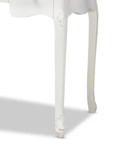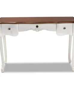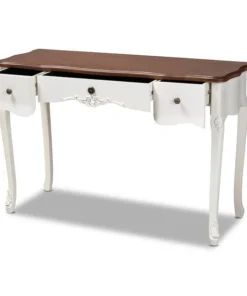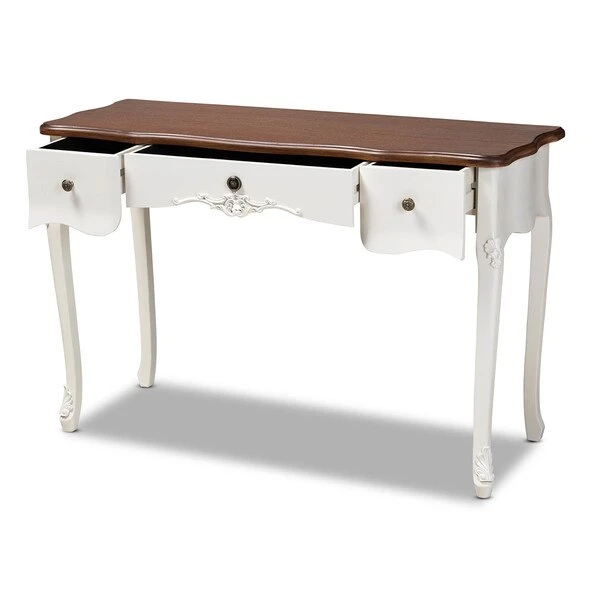 Display your favorite pieces of decor on the charming Sophie console table. Constructed from wood, the Sophie features three drawers with space to store keys, bills, and more. Its classic white finish complements the brown wood tabletop and highlights the stunning attention to detail in the floral moldings. Carved brass knobs and cabriole legs add a delightful French-inspired look. This versatile piece is well suited for use in an entryway, hallway, or living room. The Sophie console table requires assembly.