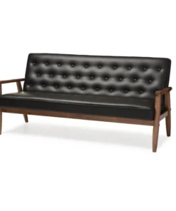 A simple, post-modern design that works well with a variety of styles, the Sorrento 3-seater sofa is upholstered in black faux leather with solid rubberwood legs and frame. The sculptural arms and wide, welcoming seat are a throwback to classic 1950s and 60s Danish design. A fully upholstered seat with exposed dark walnut wood looks great from all angles, whether in a lounge arrangement, public waiting area or private office. The splayed legs and button-tufting design add a retro modern touch to this piece of clean lines furniture. The Sorrento features light weight and easy handling. It will be suitable for those urban dwellers with limited space. It could be a cool-looking reading nook within 30 minutes of assembly out of a box. The Sorrento will be a standout piece in any modern interior.
