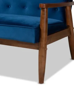 A simple, post-modern design that works well with a variety of styles, the Sorrento sofa is upholstered in a grey velvet fabric and features a rubberwood frame. The sculptural arms and wide, welcoming seat are a throwback to classic 1950s and 1960s Danish design. Splayed legs and button-tufting add a retro modern touch. The fully upholstered seat with exposed dark walnut wood looks great from all angles, whether in a lounge arrangement, public waiting area or private office. Its light weight and easy handling also make it suitable for those urban dwellers with limited space. The Sorrento sofa requires assembly.