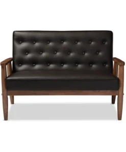A simple, post-modern design that works well with a variety of styles, the Sorrento 2-seater loveseat is upholstered in brown faux leather with solid rubberwood legs and frame. The sculptural arms and wide, welcoming seat are a throwback to classic 1950s and 60s Danish design. A fully upholstered seat with exposed dark walnut wood looks great from all angles, whether in a lounge arrangement, public waiting area or private office. The splayed legs and button-tufting design add a retro modern touch to this piece of clean lines furniture. The Sorrento features light weight and easy handling. It will be suitable for those urban dwellers with limited space. It could be a cool-looking reading nook within 30 minutes of assembly out of a box. The Sorrento will be a standout piece in any modern interior.