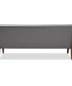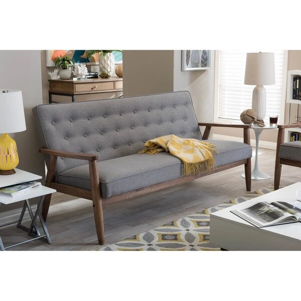 A simple, post-modern design that works well with a variety of styles, the Sorrento 3-seater sofa is upholstered in grey polyester fabric with solid rubberwood legs and frame. The sculptural arms and wide, welcoming seat are a throwback to classic 1950s and 60s Danish design. A fully upholstered seat with exposed dark walnut wood looks great from all angles, whether in a lounge arrangement, public waiting area or private office. The splayed legs and button-tufting design add a retro modern touch to this piece of clean lines furniture. The Sorrento features light weight and easy handling. It will be suitable for those urban dwellers with limited space. It could be a cool-looking reading nook within 30 minutes of assembly out of a box. The Sorrento will be a standout piece in any modern interior.