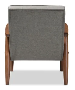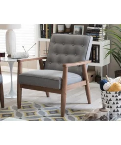 A simple, post-modern design that works well with a variety of styles, the Sorrento lounge chair is upholstered in grey fabric with solid rubberwood legs and frame. The sculptural arms and wide, welcoming seat are a throwback to classic 1950s and 60s Danish design. A fully upholstered seat with exposed dark walnut wood looks great from all angles, whether in a lounge arrangement, public waiting area or private office. The splayed legs and button-tufting design add a retro modern touch to this piece of clean lines furniture. The Sorrento also features light weight and easy handling. It will be suitable for those urban dwellers with limited space. It could be a cool-looking reading nook within 30 minutes of assembly out of a box. The Sorrento will be a standout piece in any modern interior.