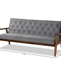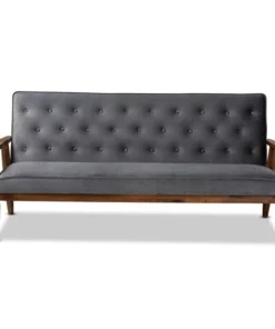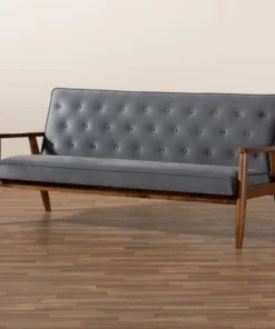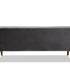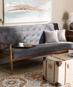 A simple, post-modern design that works well with a variety of styles, the Sorrento sofa is upholstered in a grey velvet fabric and features a rubberwood frame. The sculptural arms and wide, welcoming seat are a throwback to classic 1950s and 1960s Danish design. Splayed legs and button-tufting add a retro modern touch. The fully upholstered seat with exposed dark walnut wood looks great from all angles, whether in a lounge arrangement, public waiting area or private office. Its light weight and easy handling also make it suitable for those urban dwellers with limited space. The Sorrento sofa requires assembly.