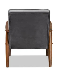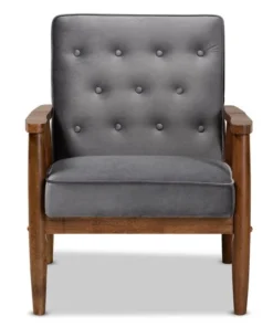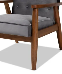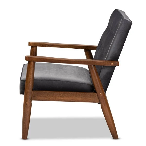 A simple, post-modern design that works well with a variety of styles, the Sorrento lounge chair is upholstered in a grey velvet fabric and features a rubberwood frame. The sculptural arms and wide, welcoming seat are a throwback to classic 1950s and 1960s Danish design. Splayed legs and button-tufting add a retro modern touch. The fully upholstered seat with exposed dark walnut wood looks great from all angles, whether in a lounge arrangement, public waiting area or private office. Its light weight and easy handling also make it suitable for those urban dwellers with limited space. The Sorrento lounge chair requires assembly.