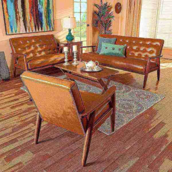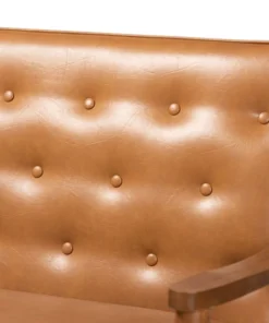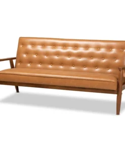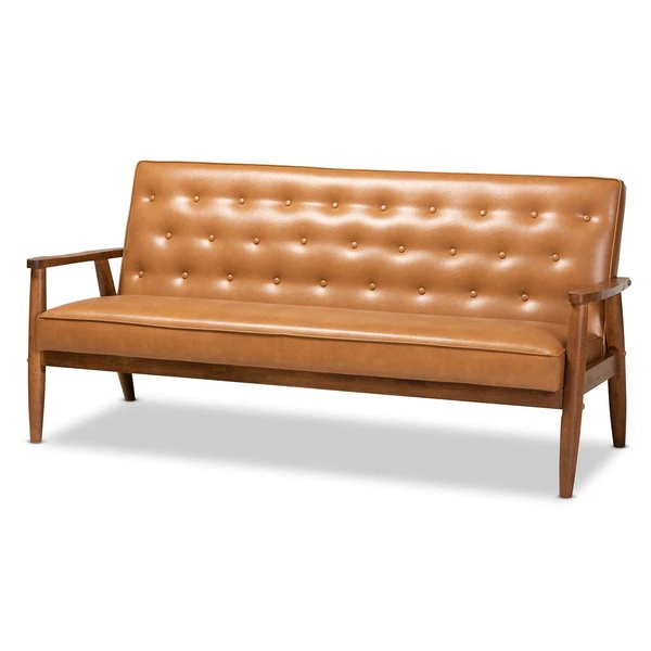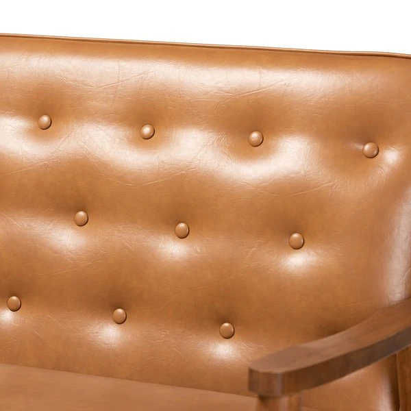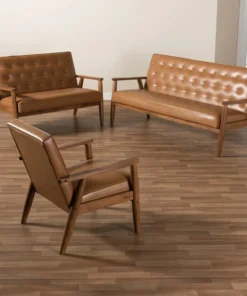 Showcasing minimalist, post-modern design, the Sorrento living room set adds unique charm to any space. Made in Malaysia, this set includes one sofa, one loveseat, and one chair. Each piece is constructed from sturdy wood padded with soft foam and upholstered in smooth, tan-colored faux leather. The stunning wood frames showcase a warm walnut brown finish and feature long legs that form ergonomic armrests. Requiring assembly, each backrest is accented with elegant button tufting that lends dimension and character. Featuring an eye-catching design that radiates retro design influence, the Sorrento living room set elevates the personality of any space.