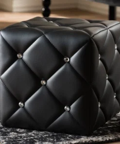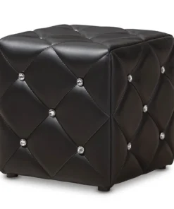 Add a touch of glam to your home with the Stacey ottoman. The solid and engineered wood construction makes this ottoman a sturdy yet compact addition to your livingroom, entryway, bedroom, or any shared space. The modern and contemporary-inspired Stacey features black faux leather upholstery and foam padding. The button-tufting with faux crystal details of this ottoman can give your space a little bit of the luxe and glam look to complete the style you want. The Stacey is chic, compact, and comes fully assembled.