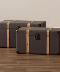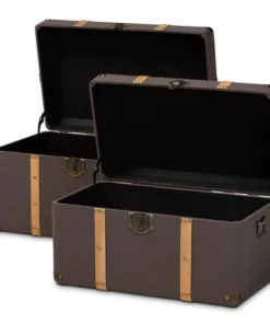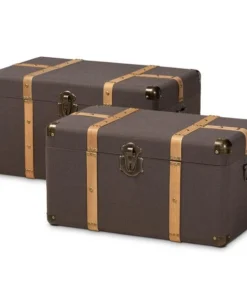 Organize your space in style with the Stephen trunk set. The Stephen features one large trunk and one smaller trunk to provide ample storage space for various items. Oak brown finished bands lined with gold-tone metal studs decorate each trunk and complement the dark brown fabric upholstery. These fully assembled pieces are fitted with metal handles and imitation locks to add a charming antique look. Featuring metal corner protectors, the Stephen trunks are a stylish solution to your storage needs.