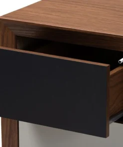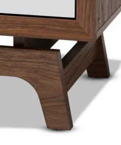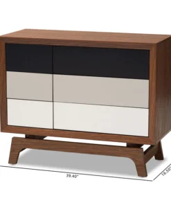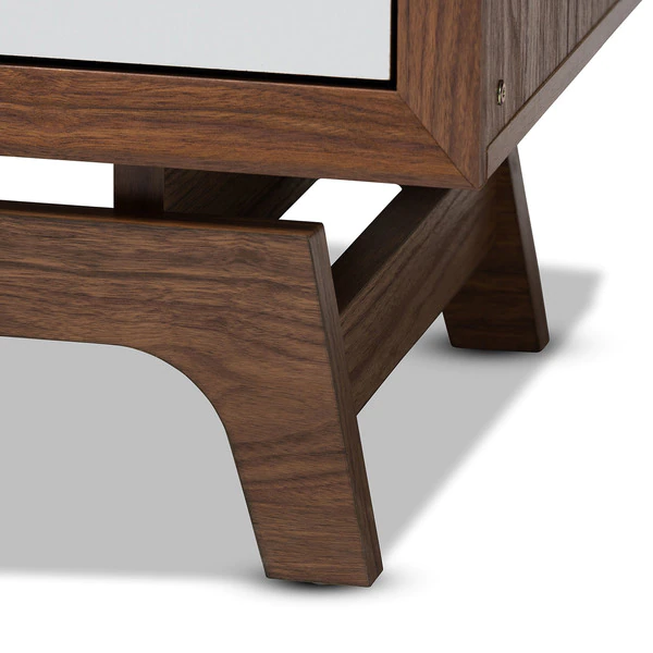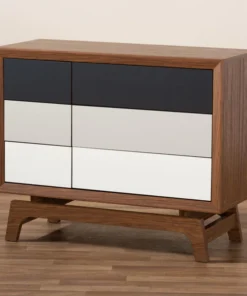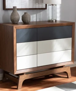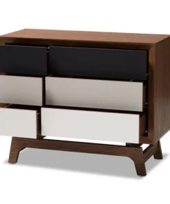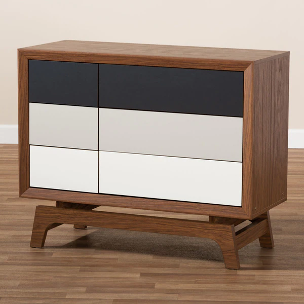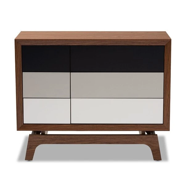 Give your space a dose of retro flair with the Svante chest. Constructed from solid MDF wood in a walnut finish, the Svante is built to be a fixture in your bedroom for years to come. Six spacious drawers provide room to store clothing, linens, and more. Each drawer is fitted with push buttons for ease in opening. The simple design of this chest is elevated by grey and white drawer fronts, which provide a cool gradient effect. Inspired by mid-century modern design, the Svante features angled legs. Pair this chest with the Svante nightstand to complete the look. The Svante chest requires assembly.