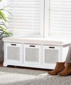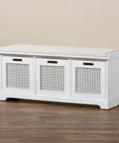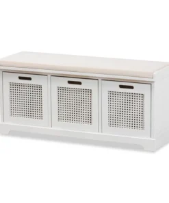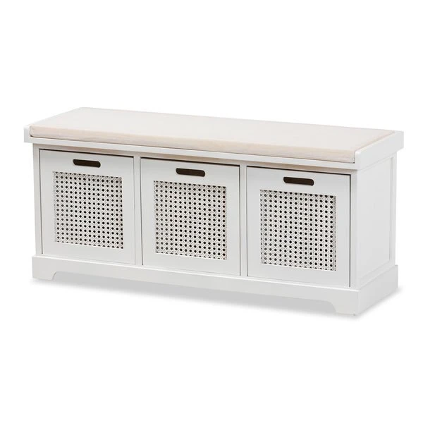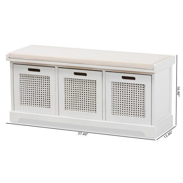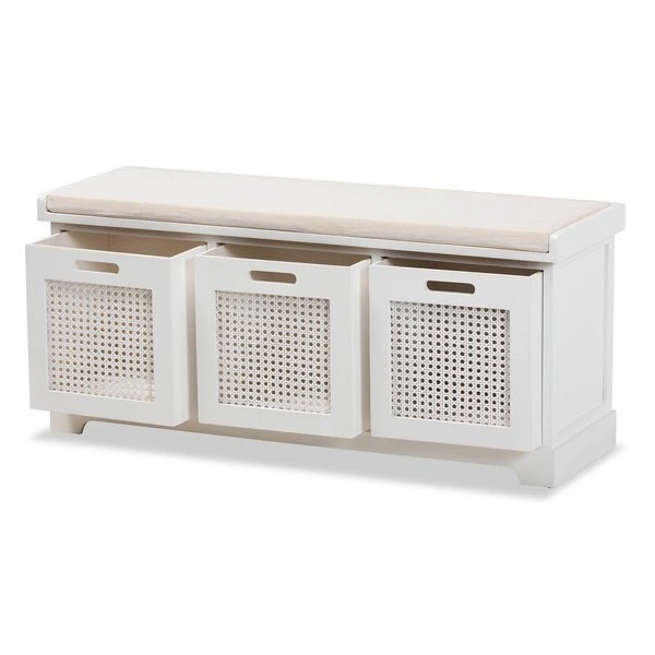 Baxton Studio Tabor Modern Beige Fabric Upholstered and White Finished Wood 3-Basket Storage Bench w/ Rattan