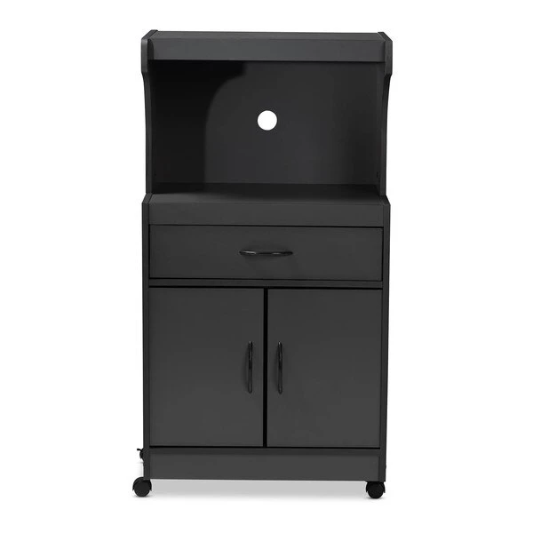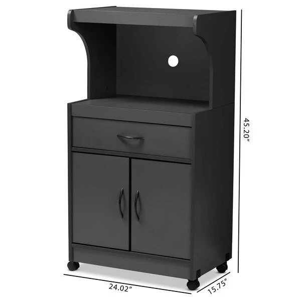 Practicality and minimalist style come together with the Tannis kitchen cabinet. The modern and contemporary-inspired design is clear to see in the rectangular silhouette and subtle grooved features. The Tannis's engineered wood frame is finished in a sophisticated dark grey finish. The cabinet features two shelf spaces behind discreet doors, and a drawer on top of them for additional storage. The Tannis's top compartment has ample space for a microwave, with a cut-out in the back panel for wire management. The drawer and door handles are finished in black to complete the sleek look. The Tannis comes with castors for mobility, so this cabinet can provide storage for utensils and dishware, and can be moved easily for cleaning. The kitchen cabinet requires assembly.