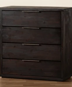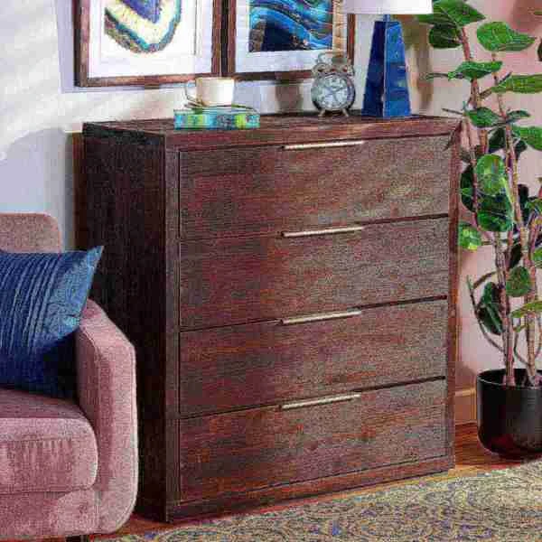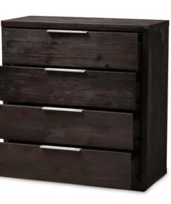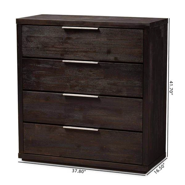 With a broad yet streamlined design, the Titus chest adds quality storage space in stunning style. Made in Malaysia, the Titus is constructed from sturdy wood showcasing a rich dark brown finish. Four spacious drawers provide ample space to help organize and declutter any space. Fully assembled, the chest is equipped with silver-tone metal handles for a sleek look and easy access. Its versatile design and strong color palette allow it to easily blend in with a variety of room layouts, making the Titus chest a fantastic addition to any space.