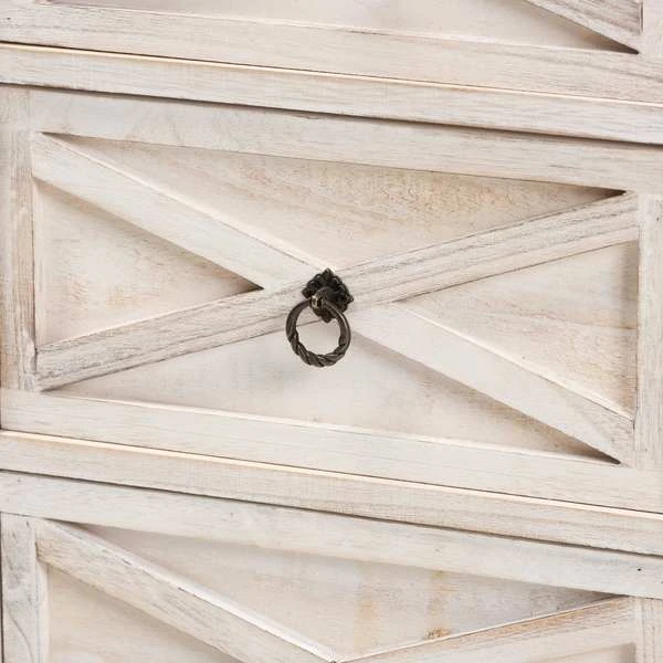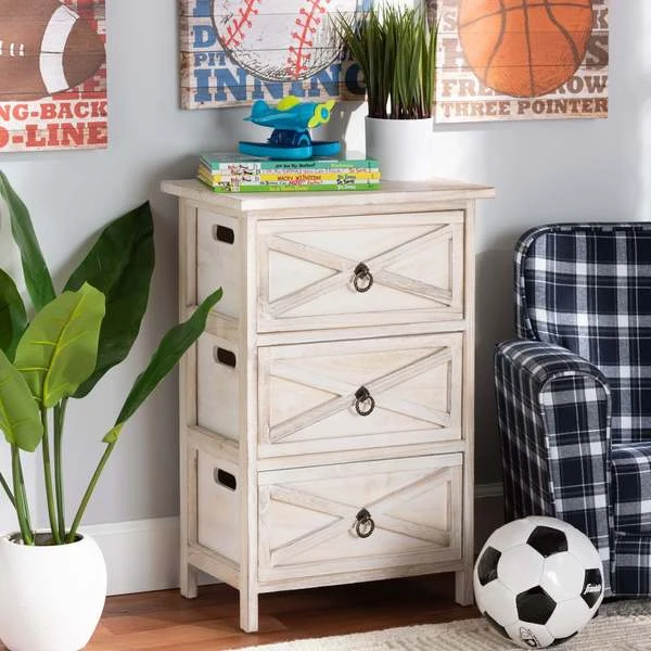 Give your space a charming, countryside feel with the fantastic design of the Tracen storage unit. Made in China, this unit is crafted from lightweight wood. Three drawers provide ample storage to declutter and organize busy areas of your home. Comes fully assembled, the Tracen features decorative metal ring-pulls for an industrial touch that complements the wood. Crisscross accents lend geometric appeal, making the Tracen storage unit a visually striking addition to any space.