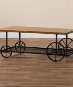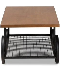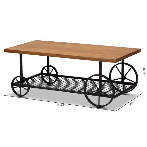Add vintage industrial charm to your space with the eye-catching Ursa coffee table. The Ursa is comprised of a black finished metal frame fitted with a walnut brown finished wood tabletop. A mesh metal shelf provides space for books and magazines while also lending a cool, industrial look. Requiring assembly, the Ursa also features decorative wheels for added rustic character. Brimming with vintage personality, the Ursa coffee table is a stunning addition to any home.