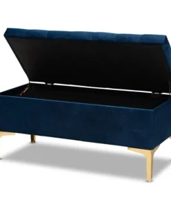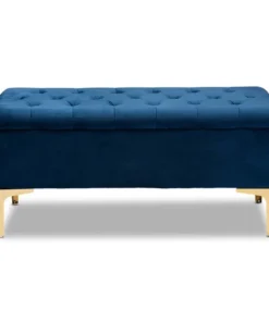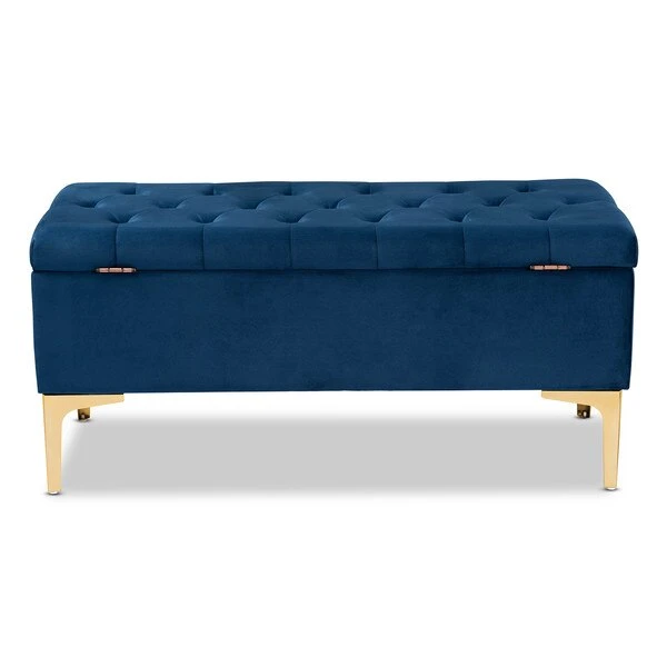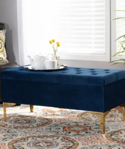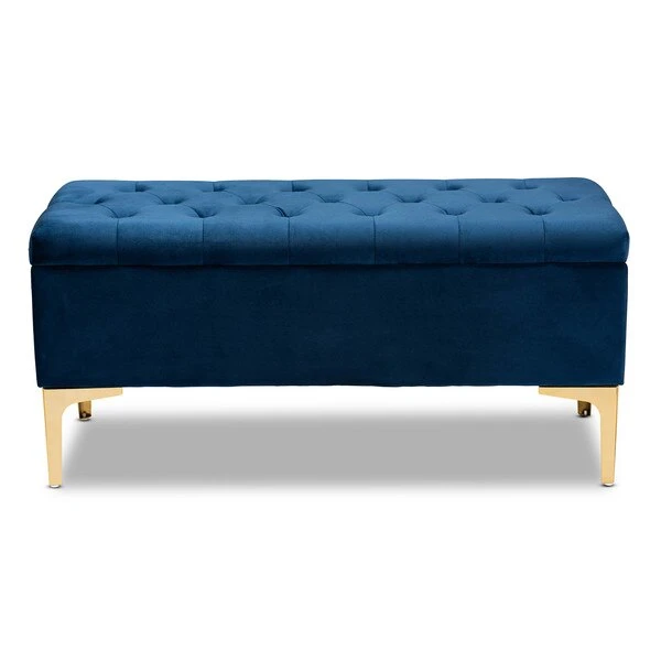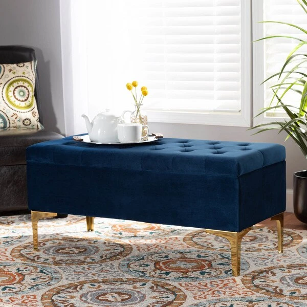 Glamorous seating doubles as practical storage in the Valere ottoman. Constructed from oak wood, the Valere is upholstered in a lavish velvet fabric and padded with foam for the utmost sitting comfort. The elegant button tufted top opens to reveal ample storage space, while gold-tone legs add a striking look. The Valere is well suited for use as a bench in your bedroom or as an accent piece in your living room. The Valere ottoman requires assembly.