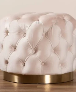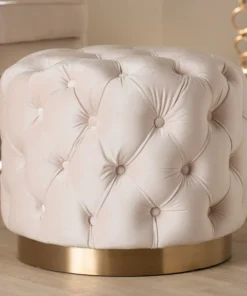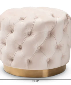 Modern glamour meets comfort in the Valeria ottoman. Constructed from sturdy plywood and stainless steel, the Valeria is padded with foam and upholstered in a rich velvet fabric that is soft to the touch. A striking brushed-gold finish on the base adds a touch of luxury, while all-over button tufting highlights the subtle sheen of the velvet. Use this versatile piece as a footstool or as extra seating for guests. The Valeria ottoman will arrive fully assembled.