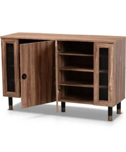 Keep your entryway organized with the Valine shoe storage cabinet. Two doors, fitted with black plastic knobs, conceal eight shelves with storage space for multiple pairs of shoes. Screen inserts provide ventilation to deter shoe odor buildup. The cabinet is supported by sturdy two-tone black plastic and solid wood legs. Constructed with an engineered wood frame, the Valine showcases an oak finish that displays the natural grain patterns in the wood, giving the cabinet a rustic touch. The Valine shoe storage cabinet requires assembly.