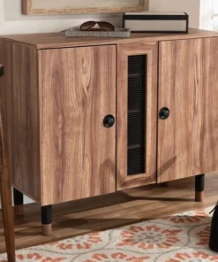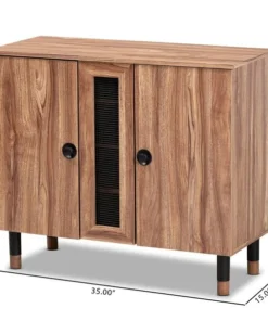 Keep your entryway organized with the Valine shoe storage cabinet. Two doors, fitted with black plastic knobs, conceal four shelves with storage space for multiple pairs of shoes. A screen insert in the middle of the cabinet provides ventilation to deter shoe odor buildup. The cabinet is supported by sturdy two-tone black plastic and solid wood legs. Constructed with an engineered wood frame, the Valine showcases an oak finish that displays the natural grain patterns in the wood, giving the cabinet a rustic touch. The Valine shoe storage cabinet requires assembly.