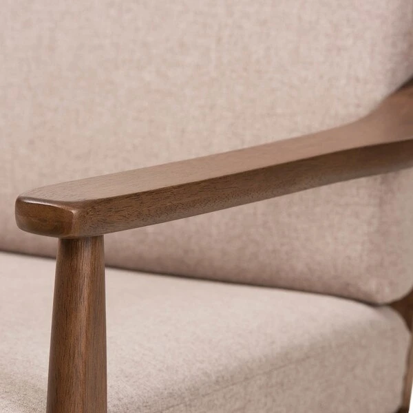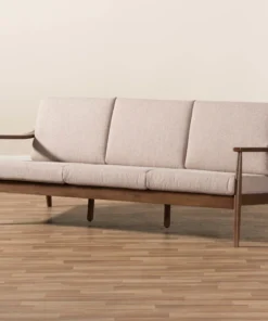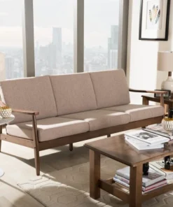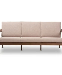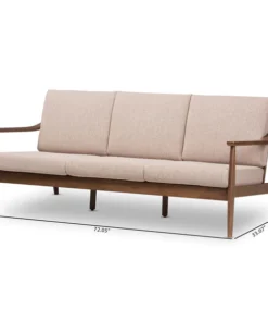 Look forward to unwinding after a long day, with the casual and relaxing design of the Venza 3-seater sofa. Constructed of solid rubberwood frame for strength and long-lasting durability, this mid-century modern-inspired sofa is built with clean paneled lines on the back, bringing relaxing vibes into your living room and complementing your home with lavish style. Cushions are upholstered in a soft but resilient light brown polyester fabric for plush comfort and lasting good looks. Featuring splayed legs with sloping arms for a mix of minimalist and contemporary styling in your space, the Venza is perfect as a lounge seating or an occasional seating in your living area, bedroom, or in a lounge arrangement, public waiting area or private office. The Venza requires assembly.
