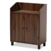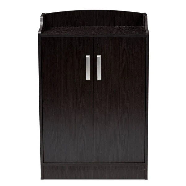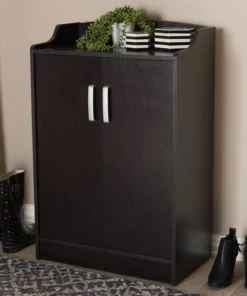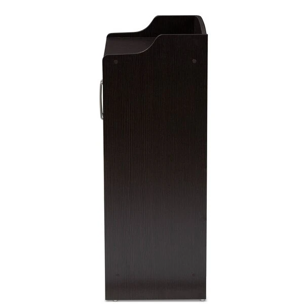 If you're looking for a simple solution to your storage and organization woes, then the Verdell shoe cabinet is for you. The modern and contemporary-inspired design is unassuming and easy to blend and coordinate with your existing decor. The Verdell is finished in a wenge brown and has silver-finished door handles. The shoe cabinet features four shelves discreetly placed behind two hinged doors with a magnetic closure, which can serve as a shoe rack or other entryway storage. The Verdell also features an open, top storage space with three sides. This shoe cabinet can help keep save space in your mudroom, entryway, and closets. The Verdell requires assembly.