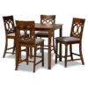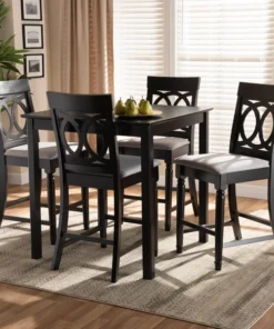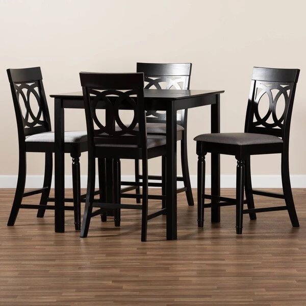 Elegant yet comfortable, the Verina 5-piece pub set is a timeless addition to any space. Constructed from solid oak wood in an espresso finish, this pub set includes one table and four stools, each upholstered in a light polyester fabric that complements the dark wood finish. Padded with foam for the utmost comfort as you enjoy long dinners, each stool features a striking cut-out design on its back for enhanced visual appeal. Comfortable and stylish, the Verina set is sure to elevate any dining experience. The Verina 5-piece pub set requires assembly.