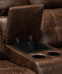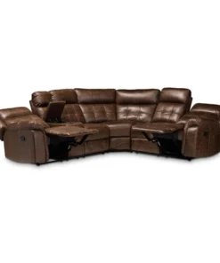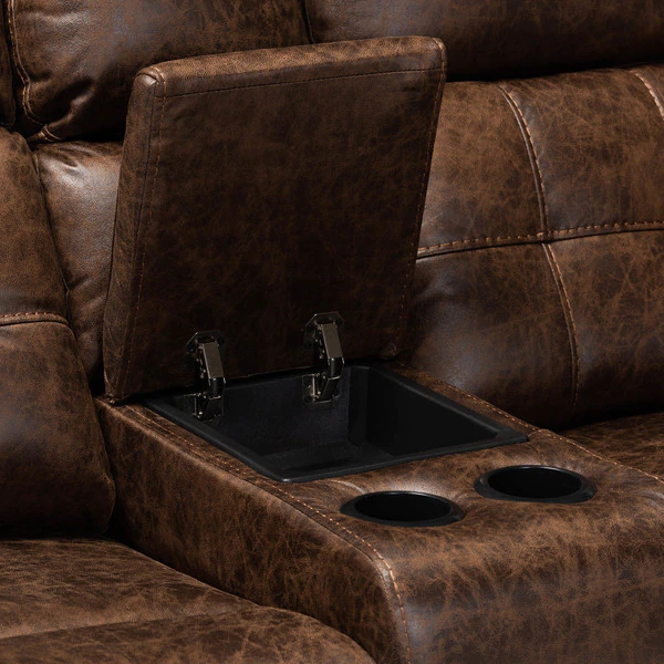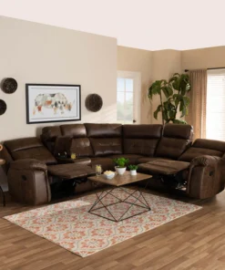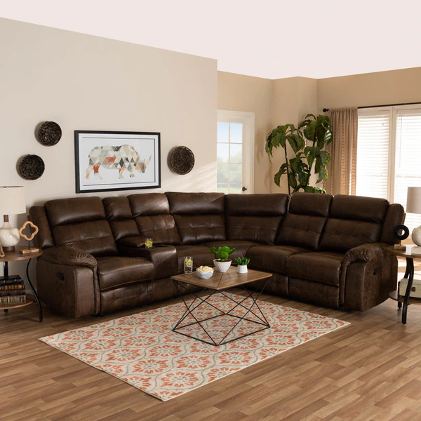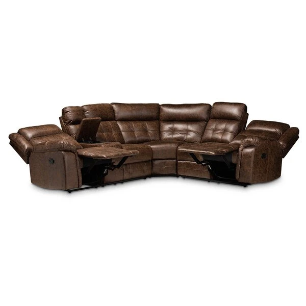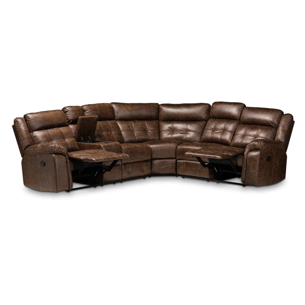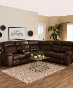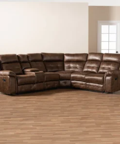 Create the ultimate hang out spot in your living room with the Vesa sectional sofa. Constructed from sturdy poplar wood and steel, the Vesa is upholstered in a sleek, distressed leather-like polyester fabric and padded with foam for plush comfort. This 6-piece sectional includes two armless chairs, one corner wedge, and two armchairs equipped with manual recline capability for the utmost relaxation. Each seat back displays contrast stitching for a touch of texture and definition. The Vesa also features a console fitted with two beverage holders so you can enjoy your favorite drinks as you relax. The Vesa sectional sofa requires assembly.