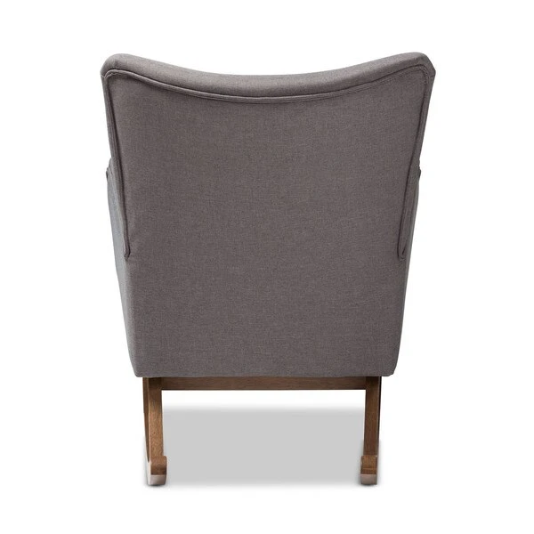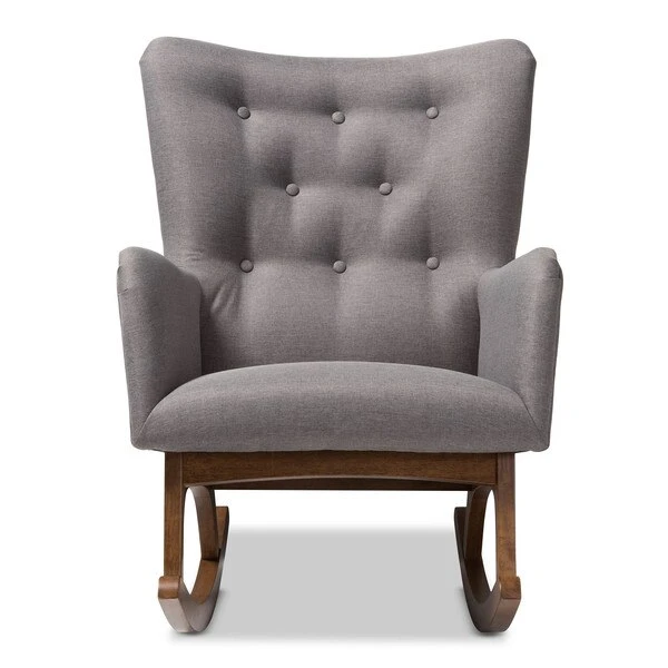 The Waldmann rocking chair embodies elegance, sophistication, and comfort. This mid-century modern-inspired rocking chair is upholstered in grey fabric, resting stylishly on solid, walnut-finished rubberwood legs. The Waldmann features a tasteful, button-tufted wingback with foam padding. This fashionable chair will look right at home in your livingroom, nursery, or any shared space, as the subtle design makes it easy to coordinate with your decor. Complete the clean, polished look with other pieces available in the Waldmann range. The Waldmann requires assembly.