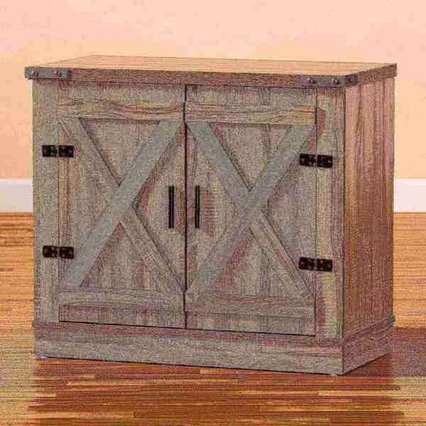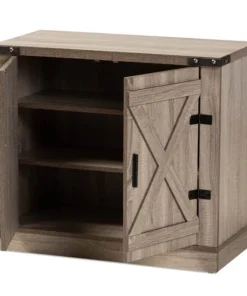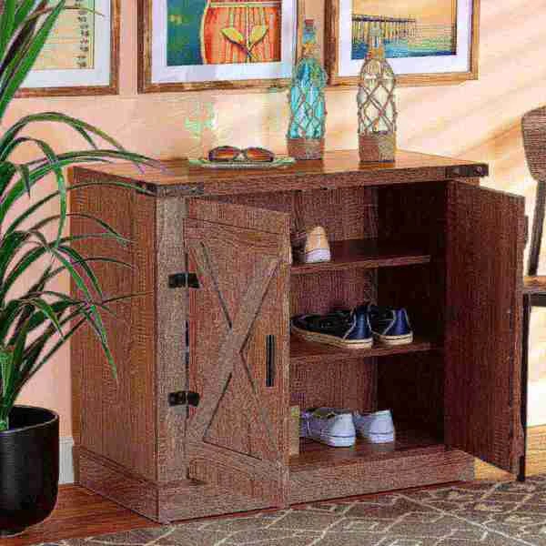 Featuring an eye-catching farmhouse inspired design, the Wayne shoe cabinet is a stylish solution to organizing your entryway. Made in Malaysia, the Wayne is crafted from sturdy wood finished in a light oak brown. The hinged doors reveal three spacious shelves capable of storing around 9 pairs of shoes, depending on size. Requiring assembly, the large, rectangular tabletop offers ample surface area to place keys, mail, and other miscellaneous items. Showcasing a striking aesthetic that adds personality to any space, the Wayne shoe cabinet is sure to elevate any home.