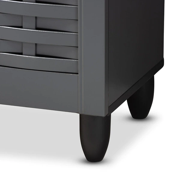 Keep your shoes organized and out of sight with the Winda cabinet. Featuring a stylish contemporary design and dark grey finish, the Winda is easy to coordinate with any style of decor. Three doors conceal four shelves with storage space for up to 12 pairs of shoes. Slits are embedded within the doors to enable air circulation and prevent mold growth on your shoes. The Winda cabinet requires assembly.