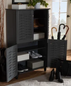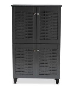 Keep your shoes organized and out of sight with the Winda cabinet. Featuring a stylish contemporary design and dark grey finish, the Winda is easy to coordinate with any style of decor. Four doors conceal four shelves with storage space for up to 18 pairs of shoes. Slits are embedded within the doors to enable air circulation and prevent mold growth on your shoes. The Winda cabinet requires assembly.