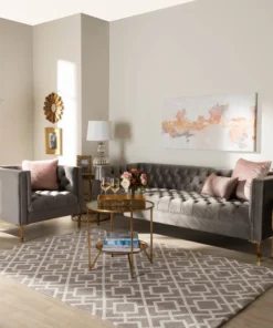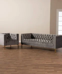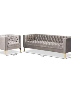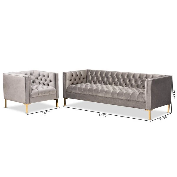 Create a glamourous sanctuary in your living room with the Zanetta 2-piece sofa set. Featuring one sofa and one lounge chair, this luxe set displays clean, tailored silhouettes and chic velvet fabric upholstery. All-over button tufting and piping trim highlight the subtle sheen of the velvet and impart a sophisticated look. Lustrous gold-finished legs complement the velvet upholstery and give the pieces a truly luxurious feel. Equal parts stylish and comfortable, each piece is padded with foam for the utmost sitting comfort. A stunning addition to both private residences and public reception spaces, the Zanetta set is sure to transform any space. The Zanetta 2-piece sofa set requires assembly.