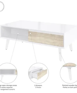 Your living room will look amazing once you add this beautiful and stylish Coffee Table. The additional storage space is ideal to keep your space clean and organized. You can use the drawers to organize your small living room accessories, and the open storage areas for big items like board games and books. The top of the table is perfect to display your decorations such as picture frames and candles. For a final contemporary touch, the painted wooden legs are perfect.