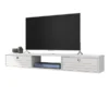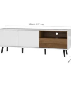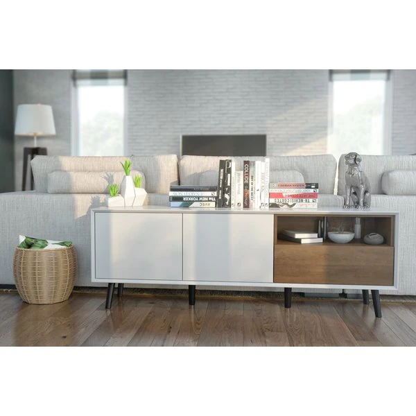 Upgrade your living room by adding a modern and minimalist TV Stand to your decor. The unit’s two-tone design and tapered solid wood legs add a contemporary touch to any space. The durable surface keeps your television sturdy, while the open storage compartment easily holds your media or gaming equipment. The small drawer allows you to organize small items and accessories such as games, movies, remote controls, and more. The closed storage area with two adjustable shelves is easily accessible thanks to convenient push latches on each door. Keep pesky wires and cables out of sight thanks to a grommet on the back panel of the TV Stand.