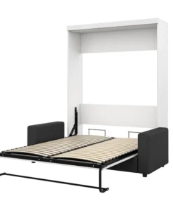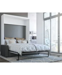 Queen Murphy bedNebula Collection by Bestar is the ideal solution for organizing small spaces for multiple purposes. With crisp, modern lines, create your dream layout by combining the different units to meet your needs according to the available space. The mechanism provides a simplified assembly of the Murphy bed. Increased comfort due to the Euro slat mattress support system. A simple and safe dual piston system makes opening and closing user-friendly. Easy to use; use the handle to pull the bed towards you to lower the bed and flip the leg down onto the floor. The bed when opened will require a clearance of 92. 3“ from the wall extending into the room. The minimum height required of the ceiling is 91 in. Clearance of 9. 6“ under the bed when it is open. Mattress not included. Accommodates most standard Queen mattresses. The mattress must meet the following requirements:Thickness between 20. 3 and 30. 5 cm (8 and 12 in). Weight between 27. 2 and 40. 8 kg (60 and 90 lb). Size of 203. 2 cm (L) x 152. 4 cm (W) (80 x 60 in). No futons. Box spring not required. Easy to install. Assembly required. Sofa for Queen Murphy Bed – fabric WE3Make your Murphy bed even more functional by placing this sofa against it. The resulting Murphy bed sofa combination is the perfect solution for making the most out of a very small space. It offers a place to sit, rest, lay down or sleep. Sit comfortably during the day, and when it’s time rest, simply remove the cushions and fold out the Murphy Bed. When the bed is folded out, the sleeping surface fits perfectly over the seating area and between the armrests of the sofa. As a result, you can leave the frame of the sofa in place. When the bed is folded up, the sleeping surface becomes the backrest of the couch. The seat depth is 23. 6” and its height is 17. 4”. The arm height is 4. 7” above the seat. The arm width is 6” in. The interior width of each seat is 33”. The frames for the arms are made with 4 mm plywood, the frame for the seat is made from larch.