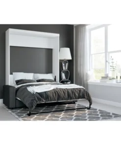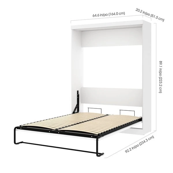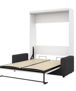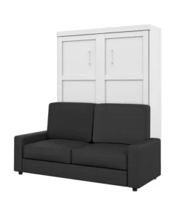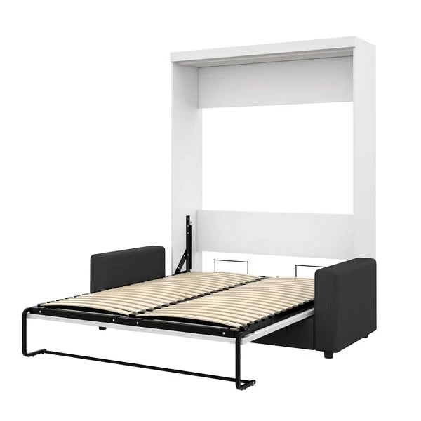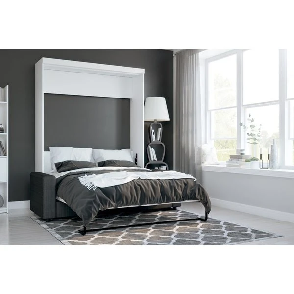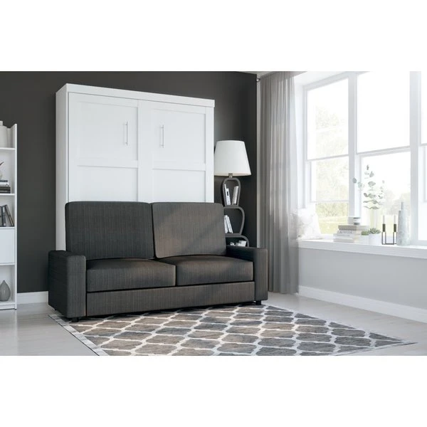 This set includes a Queen Murphy Bed and a Sofa. Queen Murphy bedCombining style and convenience, Pur by Bestar is the perfect solution to furnished condos, lofts, studios, guest’s rooms and home offices. The collection brings multi functionality to a single room. The mechanism provides simplified assembly of the Murphy bed. Increased comfort due to Euroslat mattress support system. Simple and safe dual piston system makes opening and closing user-friendly. Easy to use; use the handle to pull the bed towards you to lower the bed and flip the leg down onto the floor. The bed when opened will require a clearance of 91. 5“ from the wall extending into the room. The minimum height required of the ceiling is 91 in. Clearance of 9. 6“ under the bed when it is open. Mattress not included. Accommodates most standard Queen mattresses. The mattress must meet the following requirements:Thickness between 20. 3 and 30. 5 cm (8 and 12 in). Weight between 27. 2 and 40. 8 kg (60 and 90 lb). Size of 203. 2 cm (L) x 152. 4 cm (W) (80 x 60 in). No futons. Box spring not required. Shaker-inspired trim and metal handles on Murphy bed. Assembly required. Easy to install. Sofa for Queen Murphy bed – fabric WE3QUALITY MATERIALS: Suspension is made with 9-gauge sinuous coils. Seat cushions are filled with non-glue cotton covered with D30 foam. 2” high plastic or chrome legs. Hardwood frame. SPACE-SAVER: The sofa and murphy bed combination is the perfect solution for making the most out of your space. It offers both a place to sit and a place to sleep in very little space. To fold out the bed, simply remove the cushions and lower the bed. COMPATIBLE: The sofa can be used as an add-on to any of Bestar’s Queen Murphy bed. Alternatively, it can be placed against a wall. You can choose either plastic or chrome legs. COMFORTABLE: The seat cushions are 7. 9” thick. All fabrics have a heavy duty backing. No nails are used, only staples. NOTE: Pre-assembled, except the legs. Overall dimensions: 78” W x 33. 5” D x 39” H. Must be placed against a murphy bed or a wall to support the back cushions. Cannot be placed in the middle of a room since it does not have a backrest. Make you Murphy bed even more functional by placing this sofa against it. The resulting Murphy bed/sofa combination is the perfect solution for making the most out of a very small space. It offers a place to sit, rest, lay down or sleep. Sit