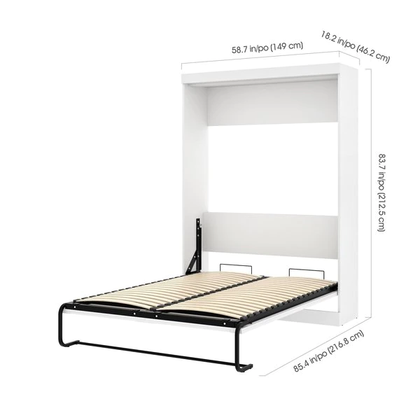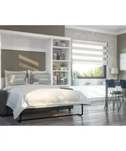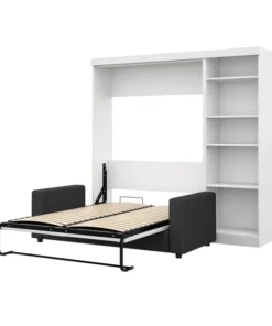 This set includes a Full Murphy Bed, one Storage Unit and a Sofa. Full Murphy bed, a Storage Unit and a Sofa (84")Combining style and convenience, Pur by Bestar is the perfect solution to furnished condos, lofts, studios, guest’s rooms and home offices. The collection brings multi functionality to a single room. The kit comprises a full size Murphy bed and a 25“ storage unit. The mechanism provides simplified assembly of the murphy bed. Increased comfort due to Euroslat mattress support system. Simple and safe dual piston system makes opening and closing user-friendly. Easy to use; use the handle to pull the bed towards you to lower the bed and flip the leg down onto the floor. Accommodates a standard full mattress up to 10“ thick and weighing at least 70 lbs. Mattress not included. Box spring not required. The storage unit has 2 fixed and 3 adjustable shelves to maximize your options. Shaker-inspired trim and metal handles on Murphy bed. Full bed when opened will require a clearance of 85. 3“ from the wall extending into the room. Clearance of 9. 6“ under the bed when it is open. Assembly required. Easy to install. Murphy bed: 58. 6“ (W) x 18. 2“ (D) x 83. 7“ (H). 25‘‘ storage unit : 25“ (W) x 18. 2“ (D) x 83. 7“ (H). Sofa for Full Wall bed – fabric WE3QUALITY MATERIALS: Suspension is made with 9-gauge sinuous coils. Seat cushions are filled with non-glue cotton covered with D30 foam. 2” high plastic or chrome legs. Hardwood frame. SPACE-SAVER: The sofa and Murphy bed combination is the perfect solution for making the most out of your space. It offers both a place to sit and a place to sleep in very little space. To fold out the bed, simply remove the cushions and lower the bed. COMPATIBLE: The sofa can be used as an add-on to any of Bestar’s Full Murphy bed. Alternatively, it can be placed against a wall. You can choose either plastic or chrome legs. COMFORTABLE: The seat Cushions are 7. 9” thick. All fabrics have a heavy duty backing. No nails are used, only staples. NOTE: Pre-assembled, except the legs. Overall dimensions: 72. 5” W x 33. 5” D x 39” H. Must be placed against a wall bed or a wall to support the back cushions. Cannot be placed in the middle of a room since it does not have a backrest. Make you Murphy bed even more functional by placing this sofa against it. The resulting Murphy bed/sofa combination is the