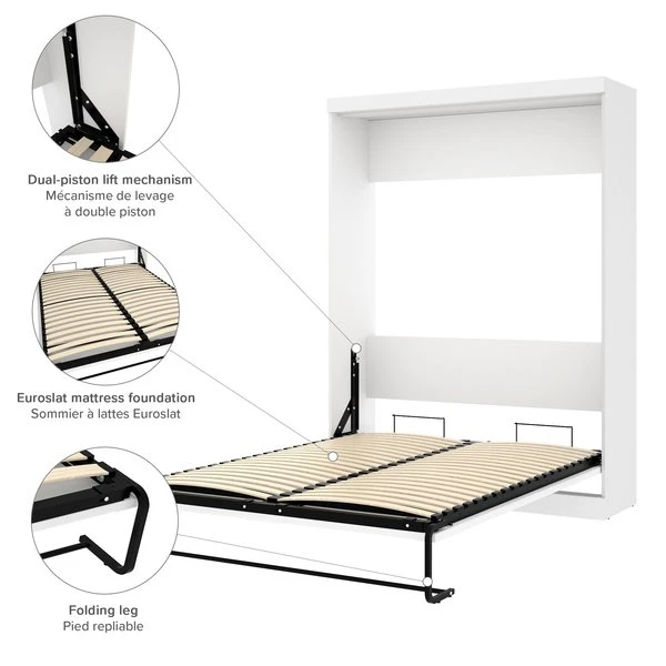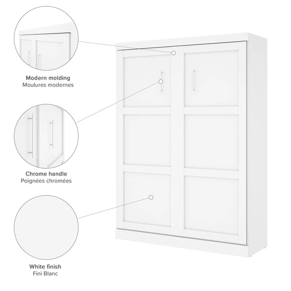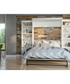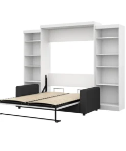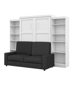 This set includes a Queen Murphy bed, two Storage Units and a SofaQueen Murphy bed, Two Storage Units and a Sofa (115") Combining style and convenience, Pur by Bestar is the perfect solution to furnished condos, lofts, studios, guest’s rooms and home offices. The collection brings multi functionality to a single room. The kit comprises a queen Murphy bed and two 25“ storage units. The mechanism provides simplified assembly of the Murphy bed. Increased comfort due to Euroslat mattress support system. Simple and safe dual piston system makes opening and closing user-friendly. Easy to use; use the handle to pull the bed towards you to lower the bed and flip the leg down onto the floor. Accommodates a standard queen mattress up to 12“ thick and weighing at least 70 lbs. Maximum dimensions of the mattress are 60“ X 80“. Mattress not included; Box spring not required. Front panel is installed as one of the last steps making the mounting to studs in a wall much easier. The minimum height required of the ceiling is 91 in. Clearance of 9. 4“ under the bed when it is open. Bed when opened will require a clearance of 101“. 2 fixed and 3 adjustable shelves in each storage unit to maximize your options. Shaker-inspired trim and metal handles on wall bed. Assembly required. Easy to install. Wall bed : 64. 6“ (W) x 20. 3“ (D) x 89. 1“ (H). 25‘‘ storage unit : 25“ (W) x 18. 2“ (D) x 83. 7“ (H). Sofa for Queen Murphy bed – fabric WE3QUALITY MATERIALS: Suspension is made with 9-gauge sinuous coils. Seat cushions are filled with non-glue cotton covered with D30 foam. 2” high plastic or chrome legs. Hardwood frame. SPACE-SAVER: The sofa and murphy bed combination is the perfect solution for making the most out of your space. It offers both a place to sit and a place to sleep in very little space. To fold out the bed, simply remove the cushions and lower the bed. COMPATIBLE: The sofa can be used as an add-on to any of Bestar’s Queen Murphy bed. Alternatively, it can be placed against a wall. You can choose either plastic or chrome legs. COMFORTABLE: The seat cushions are 7. 9” thick. All fabrics have a heavy duty backing. No nails are used, only staples. NOTE: Pre-assembled, except the legs. Overall dimensions: 78” W x 33. 5” D x 39” H. Must be placed against a murphy bed or a wall to support the back cushions. Cannot be placed in the