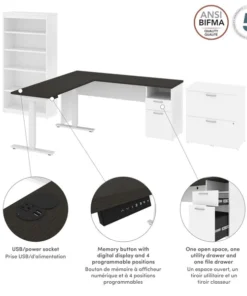 Use this fantastic desk set to fully furnish your home office or business office in one shot. The Standing Desk provides ultimate comfort by allowing you to stand whenever you want. You can easily save your favorite heights and switch positions at the push of the button. Moreover, cable management is easy thanks to the grommet and USB/power outlet on the desktop. The Bookcase and Lateral File Cabinet offer more than enough space to store books, important paperwork, and more. Keeping your office organized will be easy thanks to this complete desk set.