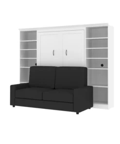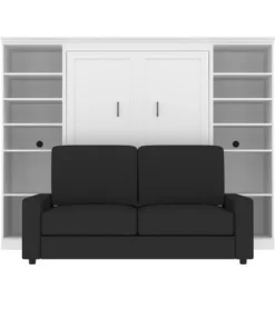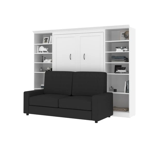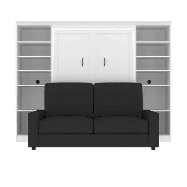 This set includes a Full Murphy Bed, Two Storage Units and a Sofa Full Murphy Bed, Two Storage Units and a Sofa (109")The Versatile collection by Bestar allows you to transform your room into a sleeping or working area. From the wall unit to the Murphy bed, furniture pieces in the Bestar Versatile Collection combine practicality and aesthetics. All surfaces feature a durable scratch, stain and burn resistant melamine finish. The kit comprises the Murphy bed and two 25“ storage units. The mechanism provides simplified assembly of the Murphy bed. Increased comfort due to Euroslat mattress support system. Simple and safe dual piston system makes opening and closing user-friendly. Accommodates most full size mattress up to 10“ thick and weighing at least 70 lbs. Maximum dimensions of the mattress are 54“ X 75“. Mattress not included; Box spring not required. Use the handle to pull the bed towards you to lower the bed and flip the leg down onto the floor. Front panel is installed as one of the last steps making the mounting to studs in a wall much easier. Finished with attractive crown molding. Bed when opened will require a clearance of 85. 4“ from the wall extending into the room. Clearance of 9. 8“ under the bed when it is open. The height of the ceiling needs to be a minimum of 85“ to be able to raise the bed during installation and a minimum of 88“ to install the crown molding. Each storage unit has 2 fixed and 4 adjustable shelves to maximize your space. Wire grommet in back panel to allow for access to electrical outlets. Dimensions : murphy bed : 58. 6 x 20 x 85. 25“ storage unit : 25 x 20 x 85. Assembly required. Easy to install. Sofa for Full Murphy Bed fabric WE3QUALITY MATERIALS: Suspension is made with 9-gauge sinuous coils. Seat cushions are filled with non-glue cotton covered with D30 foam. 2” high plastic or chrome legs. Hardwood frame. SPACE-SAVER: The sofa and Murphy bed combination is the perfect solution for making the most out of your space. It offers both a place to sit and a place to sleep in very little space. To fold out the bed, simply remove the cushions and lower the bed. COMPATIBLE: The sofa can be used as an add-on to any of Bestar’s Full Murphy bed. Alternatively, it can be placed against a wall. You can choose either plastic or chrome legs. COMFORTABLE: The seat Cushions are 7. 9” thick. All fabrics have a heavy duty backing. No nails are used,