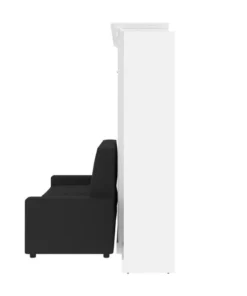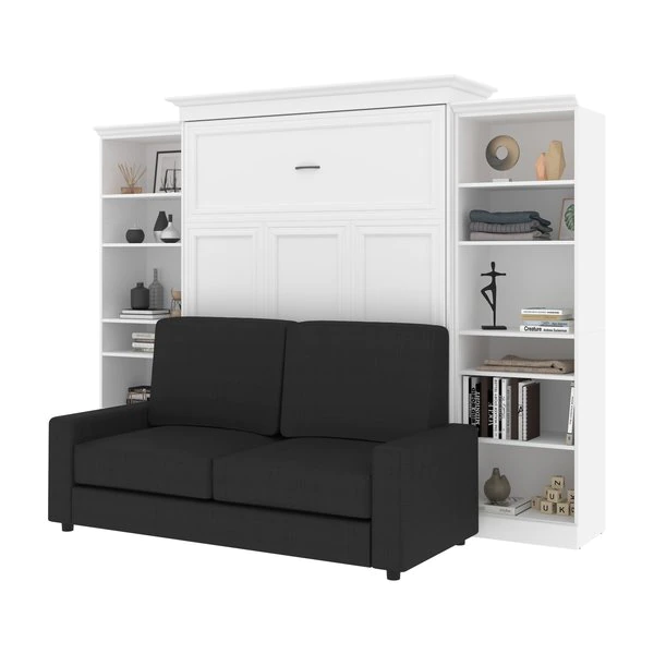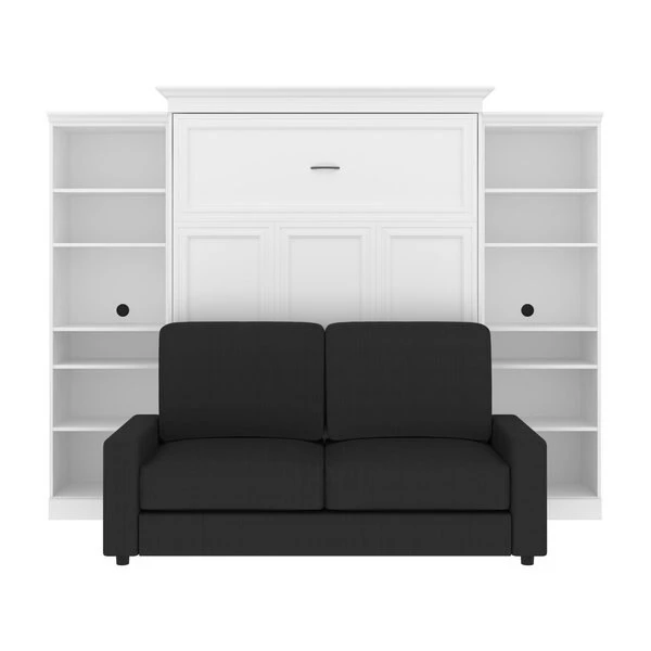 This set includes a Queen Murphy Bed, Two Storage Units and a Sofa. Queen Murphy Bed, Two Storage Units and a Sofa (115")The Versatile collection by Bestar allows you to transform your room into a sleeping or working area. From the wall unit to the murphy bed, furniture pieces in the Bestar Versatile Collection combine practicality and aesthetics. All surfaces feature a durable scratch, stain and burn resistant melamine finish. The kit comprises the Queen Murphy Bed and two 25“ storage units. The mechanism provides simplified assembly of the Murphy Bed. Increased comfort due to Euroslat mattress support system. Simple and safe dual piston system makes opening and closing user-friendly. Accommodates a standard queen mattress up to 12“ thick and weighing at least 70 lbs. Maximum dimensions of the mattress are 60“ X 80“. Mattress not included; Box spring not required. Use the handle to pull the bed towards you to lower the bed and flip the leg down onto the floor. Front panel is installed as one of the last steps making the mounting to studs in a wall much easier. Finished with attractive crown molding. Bed when opened will require a clearance of 93. 4“ from the wall extending into the room. Clearance of 9. 5“ under the bed when it is open. Bed when opened will require a clearance of 93. 4“. The height of the ceiling needs to be a minimum of 91“ to be able to raise the bed during installation and a minimum of 93“ to install the crown molding. Each storage unit has 2 fixed and 4 adjustable shelves to maximize your space. Wire grommet in back panel to allow for access to electrical outlets. Dimensions : Murphy Bed : 69. 4 x 22. 6 x 89. 9. 25“ storage unit : 25 x 20 x 85. Assembly required. Sofa for Queen Murphy Bed – fabric WE3QUALITY MATERIALS: Suspension is made with 9-gauge sinuous coils. Seat cushions are filled with non-glue cotton covered with D30 foam. 2” high plastic or chrome legs. Hardwood frame. SPACE-SAVER: The sofa and murphy bed combination is the perfect solution for making the most out of your space. It offers both a place to sit and a place to sleep in very little space. To fold out the bed, simply remove the cushions and lower the bed. COMPATIBLE: The sofa can be used as an add-on to any of Bestar’s Queen murphy bed. Alternatively, it can be placed against a wall. You can choose either plastic or chrome legs. COMFORTABLE: The seat cushions are 7. 9” thick.