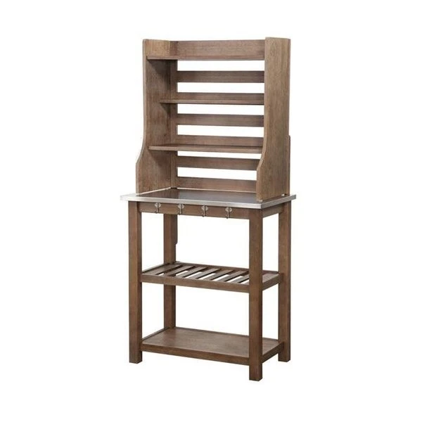 Made from mixed materials. our Napa Baker's Rack looks just as at home in an industrial loft as it does in a rustic cottage. With its array of shelving and other storage features. this rack is an all-in-one storage solution and food prep station for any kitchen. The stainless steel top and hanging hooks give the piece additional functionality. so you can actually prepare food on the surface and easily clean it up. Its solid rubberwood construction has the added bonus of being made from an environmentally friendly wood. The baker's rack comes in a multistep wire-brushed finish which adds to the piece's versatile. rugged looks. FeaturesEco-friendly rubberwood constructionOpen shelving for ample storage4 hanging hooksStainless steel cart topMulti-step wire-brush finishSpecificationsMaterials: Rubberwood. Stainless SteelFinish: Barnwood Wire-BrushDimensions: 30 x 64 x 17.5 in.Country of Origin: VietnamWeight: 40 lbs